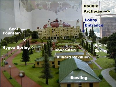 ![]() Model Hotel in a Glass Case Plaque inside Case | ![]() Model Hotel in a Glass Case in the Hotel Museum | ![]() Model with labels |