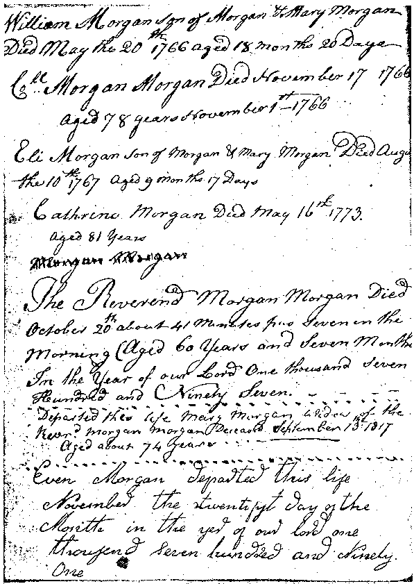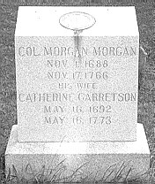 GENERATION 8132** MORGAN, Morgan (COL) born Nov 1, 1688, Glamorganshire, WALES; Married (1713 New Castle, Sussex Co DE) Garretson, Catherine; died Nov 17, 1766, Near Bunker Hill; Berkeley Co VA [now WV]; buried Morgan Chapel Cemetery. Photo of original tombstone