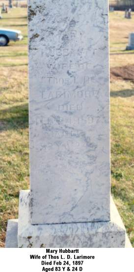 GENERATION 11 LARIMORE, Mary Edith born Apr 3, 1898, Beecher City, Effingham Co IL; Married (Apr 24, 1917, Effingham, Effingham Co IL) MCKENZIE, Jesse Lee (Photo of Jesse McKenzie); died Apr 19, 1985, Moline, Rock Island Co IL; buried Greenview Memorial Gardens Cemetery. Photo of Edith Larimore and her sister Edna about 1913. GENERATION 22 LARIMORE, William Henry "Bill" born Sep 28, 1865, Beecher City, Effingham Co IL; Married (Sep 25, 1887, Shelby Co IL) TAYLOR, Laura Belle; died Jun 20, 1949, Decatur, Macon Co IL; buried Beecher City Cemetery; occ. Farmer. Photo of his tombstone. 3 TAYLOR, Laura Belle born Apr 18, 1868, Near Holliday, Fayette Co IL; died Feb 4, 1949, Decatur, Macon Co IL; buried Beecher City Cemetery. Photo of her tombstone. GENERATION 34 LARIMORE, Charles Thomas born Jul 19, 1834, IN; Married (Oct 6, 1864, Effingham Co IL) LORTON, Samantha; died Apr 11, 1897, Liberty TWP, Effingham Co IL; buried Tipsword Cemetery; occ. Farmer. Photo of his tombstone. 5 LORTON, Samantha born Jan 15, 1846, Effingham Co IL; died Mar 21, 1889, Liberty TWP, Effingham Co IL; buried Tipsword Cemetery. Photo of her tombstone. 6 TAYLOR, Bazel White, (Photo of Bazel and his wife, Mary), born Feb 24, 1841, Monroe Twp, Knox Co OH; Married (Aug 1, 1867, Holliday, Shelby Co IL) FULKS, Mary Jane; died May 4, 1903, Beecher City, Effingham Co IL; buried Beecher City Cemetery; occ. Farmer; [Note: Civil War Soldier] Photo of Tombstone. Closeup of text. 7 FULKS, Mary Jane born May 4, 1848, PA; died May 14, 1916, Beecher City, Effingham Co IL; buried Beecher City Cemetery. Photo of Tombstone. Closeup of text. NOTE: Tombstone dates do not match her sworn statement on and final death date in, her husband's Civil War Pension File |