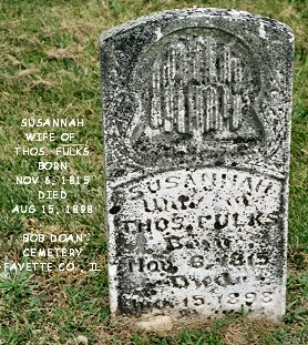 GENERATION 48 LARIMORE, Thomas Logan Douglas born Oct 25, 1808, Stokes Co NC; Married (Oct 10, 1833; Marr Book C. Pg73; Fayette Co IN) HUBBARTT, Mary Flora "Polly"; died Mar 17, 1887, Liberty TWP, Effingham Co IL; buried Beecher City Cemetery; occ. Farmer. Photo of his tombstone 9 HUBBARTT, Mary Flora "Polly" born Jan 31, 1814, Fayette Co IN; died Feb 24, 1897, Liberty TWP, Effingham Co IL; buried Beecher City Cemetery. Photo of tombstone. 10 LORTON, Samuel D. born Jan 17, 1822, "On the White River", AR; Married (Mar 28, 1843, "Old book A" Pg 21, Fayette Co IL) NICHOLS, Lucy A.; died Nov 17, 1890, Liberty TWP, Effingham Co IL; buried Lorton Cemetery; occ. Farmer. Photo of tombstone and vault. Closeup of text. 11 NICHOLS, Lucy A. born Dec 12, 1824, Fayette Co IL; died May 10, 1887, Liberty TWP, Effingham Co IL; buried Lorton Cemetery. Photo of tombstone and vault. Closeup of text. 12 TAYLOR, William born circa 1811, MD; Married (Oct 3, 1836, Knox Co OH) CRAIG, Priscilla; Married 2nd, (Mar 2, 1848 Knox Co OH) HILDRETH, Rebecca McARDLE; died Mar 14, 1886, Loudon TWP, Fayette Co IL; buried Bob Doan Cemetery; occ. Farmer. 13 CRAIG, Priscilla born abt 1813 in Knox Co OH; died bef 2 Mar 1848 in Knox Co OH. 14 FULKS, Thomas F. born Nov 24, 1804, PA; Married (before 1834, PA) AUGHENBAUGH, Susannah; died Jul 24, 1879, Loudon Twp, Fayette Co IL; buried Bob Doan Cemetery; occ. [Note: Moved to Shelby Co IL in 1854]. Photo of his tombstone 15 AUGHENBAUGH, Susannah born Nov 6, 1815, Beaver Co PA; died Aug 15, 1898, Loudon Twp, Fayette Co IL; buried Bob Doan Cemetery. Photo of her tombstone (second view) GENERATION 516 LARIMORE, Thomas Jamison born Nov 28, 1783, Henry Co VA; Married (Jan 20, 1805, Stokes Co NC) WRIGHT, Nancy Agnes; Married 2nd:(May 26, 1831, Rush Co IN) MARSH, Elizabeth; Divorced (Oct, 1836 Rush Co IN) MARSH, Elizabeth; Married 3rd: (Jan 1, 1837, Fayette Co IN) HILL, Mahala [Thompson]; died Sep 22, 1852, Rush Co IN; buried Richland Methodist Church Cemetery; occ. Listed as a miller on 1850 Census. 17 WRIGHT, Nancy Agnes born May 8, 1785, Lancaster Co PA; died Feb 16, 1831, Fayette Co IN; buried Mount Zion Cemetery; [Note: Moved to Fayette Co. IN after marriage; 1840 6 dau, 3sons]. 18 HUBBARTT, Charles born circa 1793, MD; Married (before 1810) HOLLAND, Lilla "Lillie"; Married 2nd: ???, Elizabeth; died Mar 26, 1871, Near Greenup, Cumberland Co IL; buried Greenup Cemetery; occ. County Commissioner of Fayette Co, IN 1828 - 1840. 19 HOLLAND, Lilla "Lillie" born 1788, MD or VA; died May 26, 1851, Cumberland Co IL; buried Greenup Cemetery. 20 LORTON, Henry born Aug 4, 1798, Henry Co VA; Married (circa 1820, Madison? Co IL) CARSON, Sarah; died Oct 11, 1851, Fayette Co IL; buried Lorton Cemetery; occ. Farmer, County Commissioner 4 years. [Note: Veteran of Black Hawk War]. Photo of tombstone. 21 CARSON, Sarah born Jan 6, 1800, TN; died Sep 20, 1866, Fayette Co IL; buried Lorton Cemetery. Photo of tombstone. 22 NICHOLS, Isaiah born Jul 6, 1800, Mason Co KY; Married (Feb 19, 1824, Fayette Co IL) REED, Eliza V.; living 1860, Franklin Co KS; died Dec 1875 Fayette Co IL; buried Welch Cemetery; occ. Farmer. 23 REED, Eliza V. born Aug 3, 1806, Randolph Co IL (IN Terr); living 1860, Franklin Co KS, (no further record found except buried as "Grandmother Nichols, Age Unknown", Welch Cemetery, Fayette Co IL. 26 CRAIG, Jonathan born Nov 23, 1781 Rumney, Grafton Co NH; Married (Dec 17, 1812, Knox Co OH) KYSER, Polly; died May 5, 1850 Mount Vernon, Clinton Twp, Knox Co OH; buried Ebenezer Cemetery. 27 KYSER, Polly born Dec 21, 1792 VA; died Jan 16, 1885, Mount Vernon, Clinton Twp, Knox Co OH; buried Ebenezer Cemetery. 28 FULKS, Charles born est 1780 VA; Married (Nov 18, 1797, Frederick Co VA) FARMER, Jane; died 1835 Wayne Co OH; buried Congress Cemetery. 29 FARMER, Jane born 1773; died 1830. 30* AUGHENBAUGH, Philip (John Philip) born Sep 23, 1792, Westmoreland Co PA; Married (Jun 9, 1812, Beaver Co PA) KINTNER, Christina; died Nov 28, 1876, Boardman, Mahoning Co OH; buried Boardman Cemetery; occ. Farmer. [NOTE: I am still searching for *positive* proof this is Susannah's father. Circumstantial evidence is all I have currently.] 31* KINTNER, Christina born circa 1795, Washington Co PA; died Apr 6, 1877, Boardman, Mahoning Co OH; buried Boardman Cemetery. |