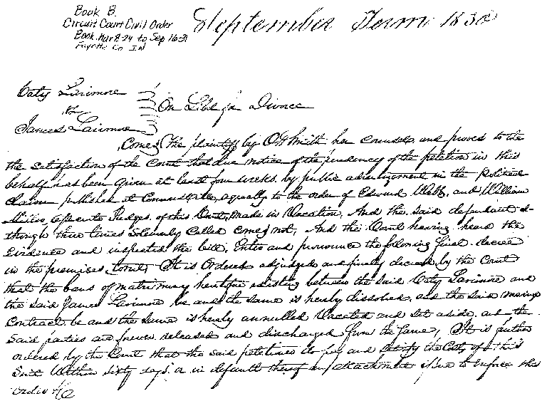 NOTE: Because Caty Larimore felt the need to obtain this divorce, it is clear that she was unaware that her estranged first husband, James, had also obtained a divorce from her prior to marrying his second wife.