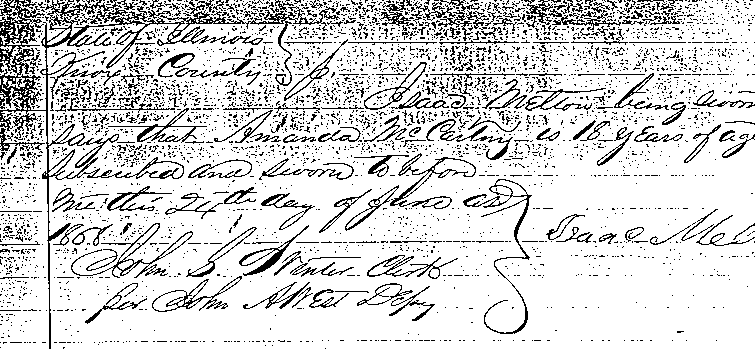 [Note from County Clerk in 1990: "This is the best that we can do - the note is glued to the affidavit of age and I am reluctant to tear these old records apart -- as you can probably tell - parts of the paper have already been lost."]