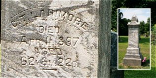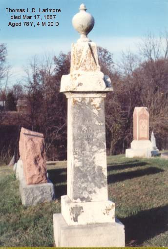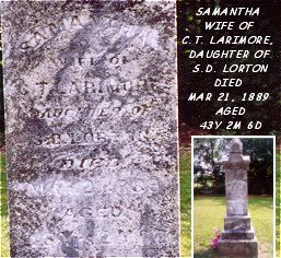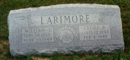 GENERATION 11 LARIMORE, Mary Edith born Apr 3, 1898, Beecher City, Effingham Co IL; Married (Apr 24, 1917, Effingham, Effingham Co IL) MCKENZIE, Jesse Lee (Photo of Jesse McKenzie); died Apr 19, 1985, Moline, Rock Island Co IL; buried Greenview Memorial Gardens Cemetery. Photo of Edith Larimore and her sister Edna about 1913. GENERATION 22 LARIMORE, William Henry "Bill" born Sep 28, 1865, Beecher City, Effingham Co IL; Married (Sep 25, 1887, Shelby Co IL) TAYLOR, Laura Belle; died Jun 20, 1949, Decatur, Macon Co IL; buried Beecher City Cemetery; occ. Farmer. Photo of his tombstone. 3 TAYLOR, Laura Belle born Apr 18, 1868, Near Holliday, Fayette Co IL; died Feb 4, 1949, Decatur, Macon Co IL; buried Beecher City Cemetery. Photo of her tombstone. GENERATION 34 LARIMORE, Charles Thomas born Jul 19, 1834, IN; Married (Oct 6, 1864, Effingham Co IL) LORTON, Samantha; died Apr 11, 1897, Liberty TWP, Effingham Co IL; buried Tipsword Cemetery; occ. Farmer. Photo of his tombstone. 5 LORTON, Samantha born Jan 15, 1846, Effingham Co IL; died Mar 21, 1889, Liberty TWP, Effingham Co IL; buried Tipsword Cemetery. Photo of her tombstone. 6 TAYLOR, Bazel White, (Photo of Bazel and his wife, Mary), born Feb 24, 1841, Monroe Twp, Knox Co OH; Married (Aug 1, 1867, Holliday, Shelby Co IL) FULKS, Mary Jane; died May 4, 1903, Beecher City, Effingham Co IL; buried Beecher City Cemetery; occ. Farmer; [Note: Civil War Soldier] Photo of Tombstone. Closeup of text. 7 FULKS, Mary Jane born May 4, 1848, PA; died May 14, 1916, Beecher City, Effingham Co IL; buried Beecher City Cemetery. Photo of Tombstone. Closeup of text. NOTE: Tombstone dates do not match her sworn statement on and final death date in, her husband's Civil War Pension File |