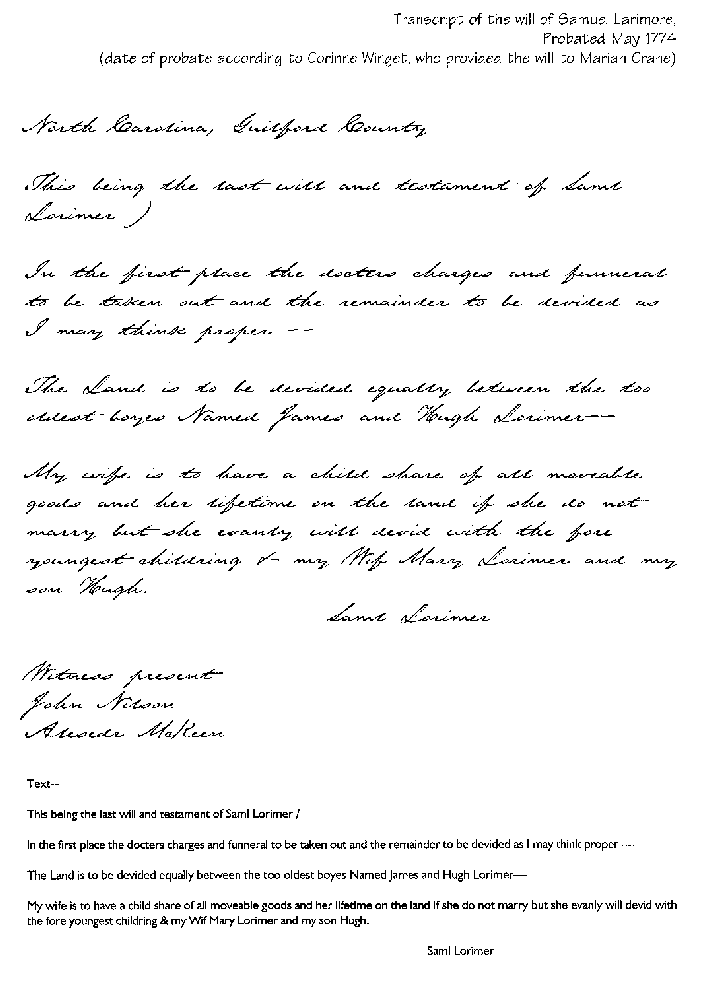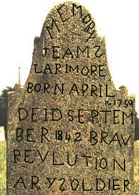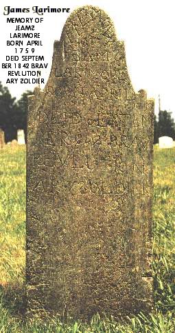 GENERATION 632 LARIMORE, James born Apr 18, 1759, SC; Married (circa 1782 Henry? Co VA) MORGAN, Catherine "Cathy" "Katy"; Married (May 25, 1823, Stokes Co NC) SOUTHERN, Leanna "Leaner"; died Sep 16, 1842, Stokes Co NC; buried Bethlehem Methodist Church Cemetery; occ. Farmer/Soldier; [Note: Rev War Vet; Pension W-5312; Land Warrent 26421]. Photo of his Tombstone Tombstone with Letters Highlighted (Proven DAR Rev War Patriot)v 33 MORGAN, Catherine "Cathy" "Katy" born c 1760 VA; Divorced (Sep 1830 Fayette Co IN) LARIMORE, James; Married 2nd (September 23, 1830, Fayette Co IN) MILNER, Amos; died before Oct 19, 1844, Fayette Co IN. 34 WRIGHT, John born circa 1755, Ireland; Married (circa 1780, Lancaster Co PA) GALT, Janet; died Dec 3, 1836, Stokes Co NC; buriedBethlehem Methodist Church Cemetery; Note: (Rev War Patriot; Wagoneer in Rev War. (PA) & gave Oath of Allegiance in PA. (Proven DAR Rev War Patriot) 35 GALT (Gault), Janet born circa 1759, Lancaster Co PA; died May 19, 1828, Stokes Co NC; buried Bethlehem Methodist Church Cemetery. %% 38 HOLLAND, Laban born roughly 1768, England?; Married (before 1788) HALES, Elizabeth; living 1788, MD. 39 HALES, Elizabeth born roughly 1768, England?; living 1788, MD. 40 LORTON, Robert born Feb 15, 1746/7, Charlotte, Charlotte Co VA; Married (Aug 15, 1779 Buckingham Co VA) GANAWAY, Tabitha; died May 16, 1833, Whitehall, Greene Co IL; buried White Hall Cemetery; occ. Farmer/soldier(Sgt); [Note: Rev War Patriot-Enlisted in Feb 1776-Discharged in Feb 1778]. His Bible Record (Proven DAR Rev War Patriot) 41 GANAWAY, Tabitha born May 14, 1763, VA; died Aug 15, 1838, Carrollton, Greene Co IL; buried White Hall Cemetery; 42 CARSON, James born 1760 to 1770, SC; Married (before 1799 SC) WEST, Elizabeth; died Nov 18, 1844, IL. 43 WEST, Elizabeth born roughly 1779; living 1830, Fayette Co IL; [Note: Possibly living in 1840 with son-in-law Henry Lorton & dau Sarah]. 44 NICHOLS, Thomas born roughly 1780; Married (Sep 29, 1799 Mason Co KY) BERRY, Dulcibela "Dolly" "Dully"; died between 1805 and 1811, Mason? Co KY or IL. 45 BERRY, Dulcibela "Dolly" "Dully" born 1782 to 1784; living 1830, Fayette Co IL. 46 REED, Oliver; Married (before 1806) DOYLE, Elizabeth; died [murdered] 25 Jul 1807, Randolph Co IL (Indiana Terr). 47 DOYLE, Elizabeth born roughly 1790; Married 2nd (Feb 26, 1811 Randolph Co IL) LEE, Ralph; died Nov 1815, Randolph Co IL. 52 CRAIG, David Jr. born Sep 2, 1746 Chester, NH; Married (Feb 23, 1770 Chester, Rockingham Co NH) RICHARDSON, Elizabeth; died Jan 15, 1809 in Rumney, Grafton Co NH. (Proven DAR Rev War Patriot) 53 RICHARDSON, Elizabeth born Aug 11, 1750 Chester, NH; died Jan 13, 1848 NH; buried Highland Cemetery. 54 John KYSER born est 1772; Married (bef. 1792) CLINE, Mary; died bef. 1810. 55 CLINE, Mary "Polly" born est. 1772; died aft. 1810 Knox Co OH. 56 Jacob FULKS born est. 1755; died aft. 1780. 60* AUGHENBAUGH, Philip (John Philip) born Nov 7, 1761; chr'd Nov 22, 1761, Lebanon? Co PA; Married (Aug 13, 1782) HARTER, Mary Ann; Married 2nd (after 1810 PA) ???, Elizabeth; died Jun 5, 1844, Beaver Co PA; buried Bethel Church Cemetery. (Proven DAR Rev War Patriot) 61* HARTER, Mary Ann born 1765 to 1774; died 1810 to 1830, PA. 62* KINTNER, Andrew born roughly 1768, PA; Married (before 1790); died before Sep 14, 1846. (Proven DAR Rev War Patriot) 63* SIMON, Elizabeth born Aug 2, 1767, York Co PA; died before Sep 14, 1846, PA. GENERATION 764 LARIMORE, Samuel born roughly 1739; Married (before 1759) FORSYTHE?, Mary; died after May 1774 Guilford Co NC. His will. 65 FORSYTHE?, Mary born roughly 1739; born est 1739; died aft 28 Jan 1794 in Caswell Co, NC. 66** MORGAN, Henry born 1727, Christiana, New Castle Co DE; Married (roughly 1747) POOLE, Deborah; Married (after 1760 VA [Now Berkeley Co, WV]) Jones, Ann; died Apr, 1824, Spartansburg Co SC. 67** POOLE, Deborah born circa 1729; living Aug 10, 1760. 68 WRIGHT, James born roughly 1735; Married (before 1755) GUNNING, Isabella; died after immigrating to Philadelphia Aug 1769. 69 GUNNING, Isabella born roughly 1735; died after 1755. 70 GALT, Thomas born 1720; Married (before 1752) WILSON, Isabella; died circa 1781, Lancaster Co PA (will probated 1781). (Proven DAR Rev War Patriot) 71 WILSON, Isabella born 1719; died 1800. 88 NICHOLS, John born 10 May 1756 in Frederick Co VA; Married 1st (before 1780) ??? (Mother of Thomas Nichols); Married 2nd (before 1802) ???, Anne; died before Mar 1, 1802, Mason Co KY. (Proven DAR Rev War Patriot) 89 ???, Rachel? born roughly 1755; died before 1798 KY. 90 BERRY, William (W.?) born roughly 1760; Married (roughly 1780) CONWAY, Dulcibella; died before Feb, 1821, Mason Co KY. (Proven DAR Rev War Patriot) 91 CONWAY, Dulcibella born roughly 1760, VA; died before 1819. 94 DOYLE, John born before 1760; died Oct 20, 1819, Randolph Co IL. 95 SMITH, Chloe born est 1766 Bedford Co VA; died bef 1810 Kaskaskia, Randolph Co, Illinois Territory. 104 CRAIG, David Sr. born est 1720; Married (before 1746) Abigail; died aft 1746 NH. 105 ???, Abigail born ca 1720; died aft 1746 Chester, Rockingham Co NH. 106 RICHARDSON, Moses born Jul 28, 1718 West Newbury, Massachusetts Bay; Married (May 6, 1746 Chester, Rockingham Co NH) GOODHUE, Mary; died Mar 30, 1806 Chester, Rockingham Co NH from a fall from a tree or killed by a falling tree. 107 GOODHUE, Mary born May 2, 1730 Chester, Rockingham Co NH; died Oct 13, 1809 Chester, Rockingham Co NH. 112 FULKS, Charles (aka Carolus Volck)born Nov 18, 1709 New York Harbor, New York Co NY; Married (Sep 23, 1731 Manatawny, Berks Co PA) HARRY, Catarina; died 1769 Lebanon Co PA buried Hebron Moravian Cemetery. 113 HARRY, Catarina born est 1710; died aft 1755 PA. 120* AUGHENBAUGH, John (Johannes) born 1732, GERMANY; Married (Jun 15, 1759) HEILMAN, Anna Marie; died before Mar 31, 1772, Lebanon TWP; (now Lebanon Co), Lancaster Co PA. 121* HEILMAN, Anna Marie born Nov 14, 1739; Married 2nd (after 1772 PA) WILDT, Theoboldt; Married 3rd HENKEL, Henry; died after 1772