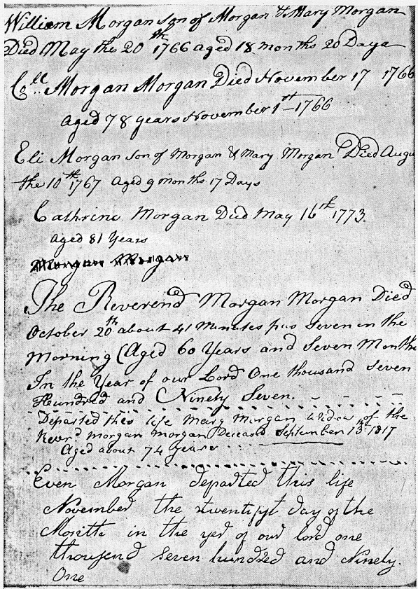 GENERATION 8132** MORGAN, Morgan (COL) born Nov 1, 1688, Glamorganshire, WALES; Married (1713 New Castle, Sussex Co DE) Garretson, Catherine; died Nov 17, 1766, Near Bunker Hill; Berkeley Co VA [now WV]; buried Morgan Chapel Cemetery. Photo of original tombstone