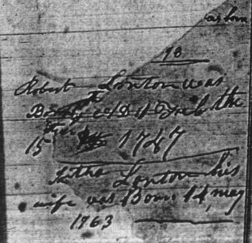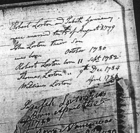 NOTE: The Bible Record above was found in, and copied from, the microfilmed Revolutionary War Pension Record of Robert Lorton of VA located at the National Archives in Washington, D.C.